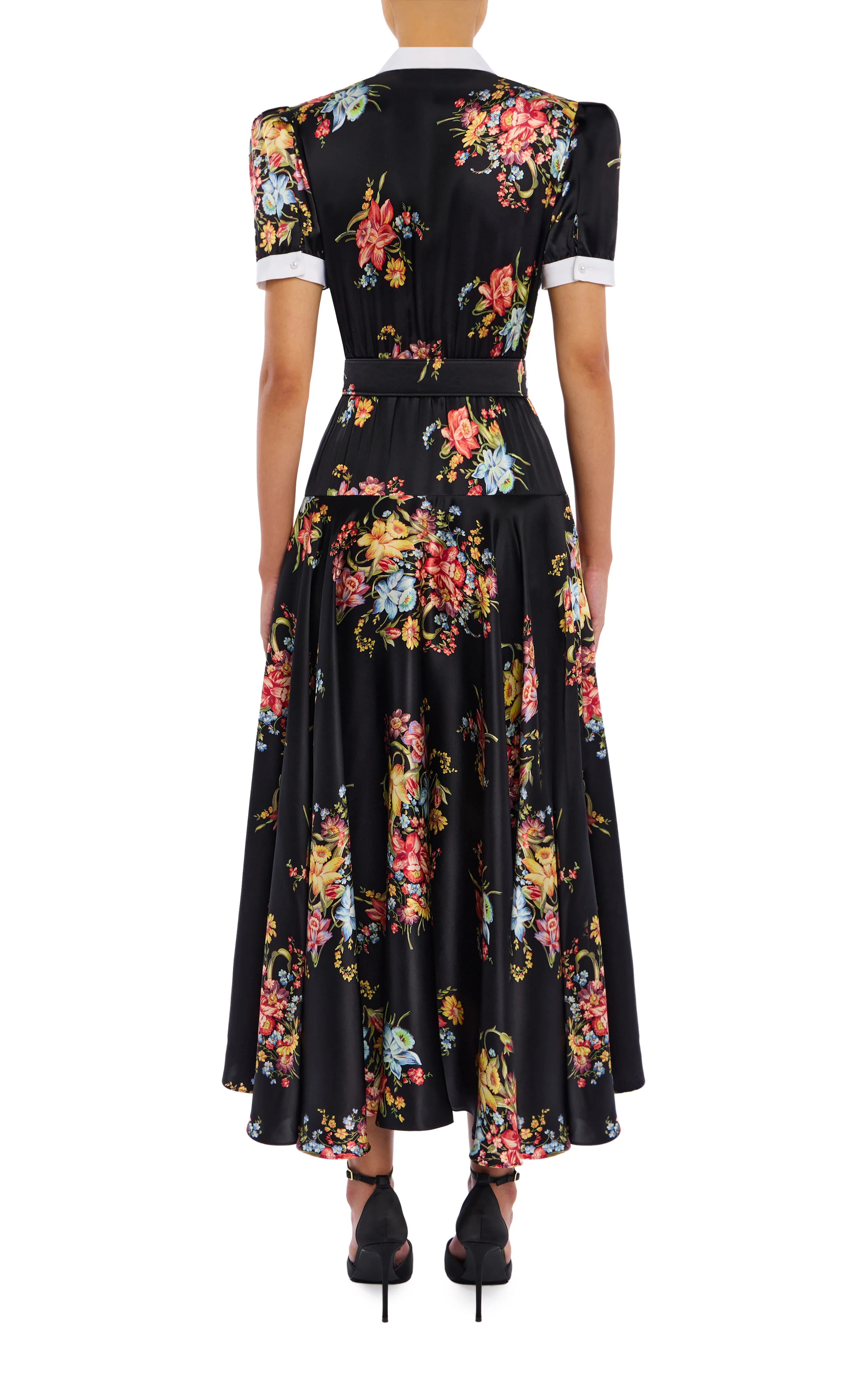 This intriguingly feminine midi cut in elegant floral printed silk twill is accented with a white silk crepe de chine notched collar and band cuffs. Lightly padded shoulders emphasize the puffed sleeves. Neatly tailored with a waist-cinching self-belt, the yoke circle skirt creates graceful movement with your every step.