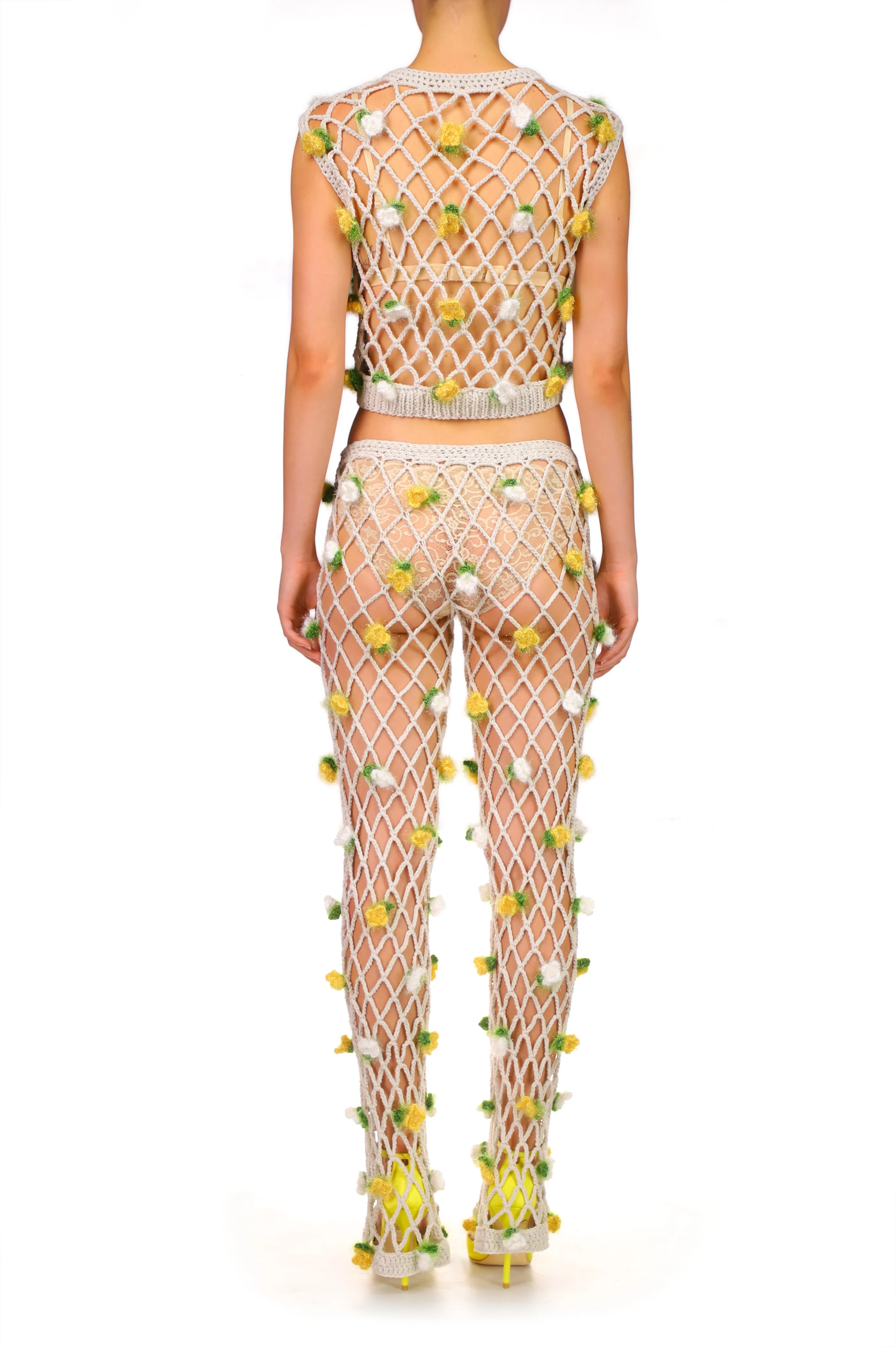 Meticulously hand crocheted in oatmeal cotton blend yarn with flecks of metallic fibers in an open fishnet pattern, it is scattered with dainty iridescent hand knit white and yellow flowers with green leaves. Complete the look with our oatmeal hand crocheted pants.