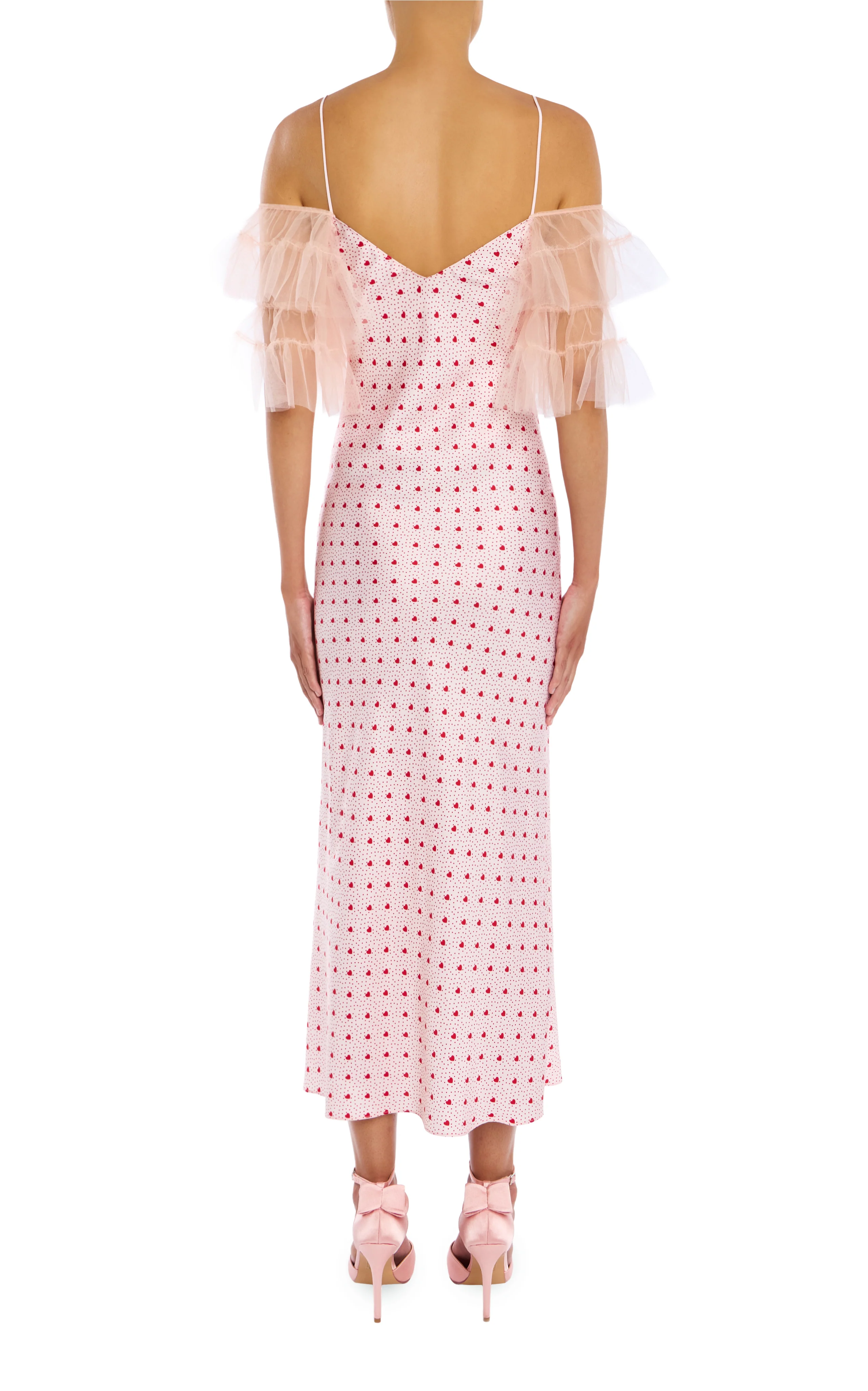Cut on the bias from lustrous pastel pink silk twill scattered with heart motifs, this tea length dress creates a streamlined silhouette that skims the body. A handmade silk rosette pin dons the neckline and the thin self-straps and ethereal ruffled sleeves of pale pink tulle allow you to choose to wear it off the shoulder.