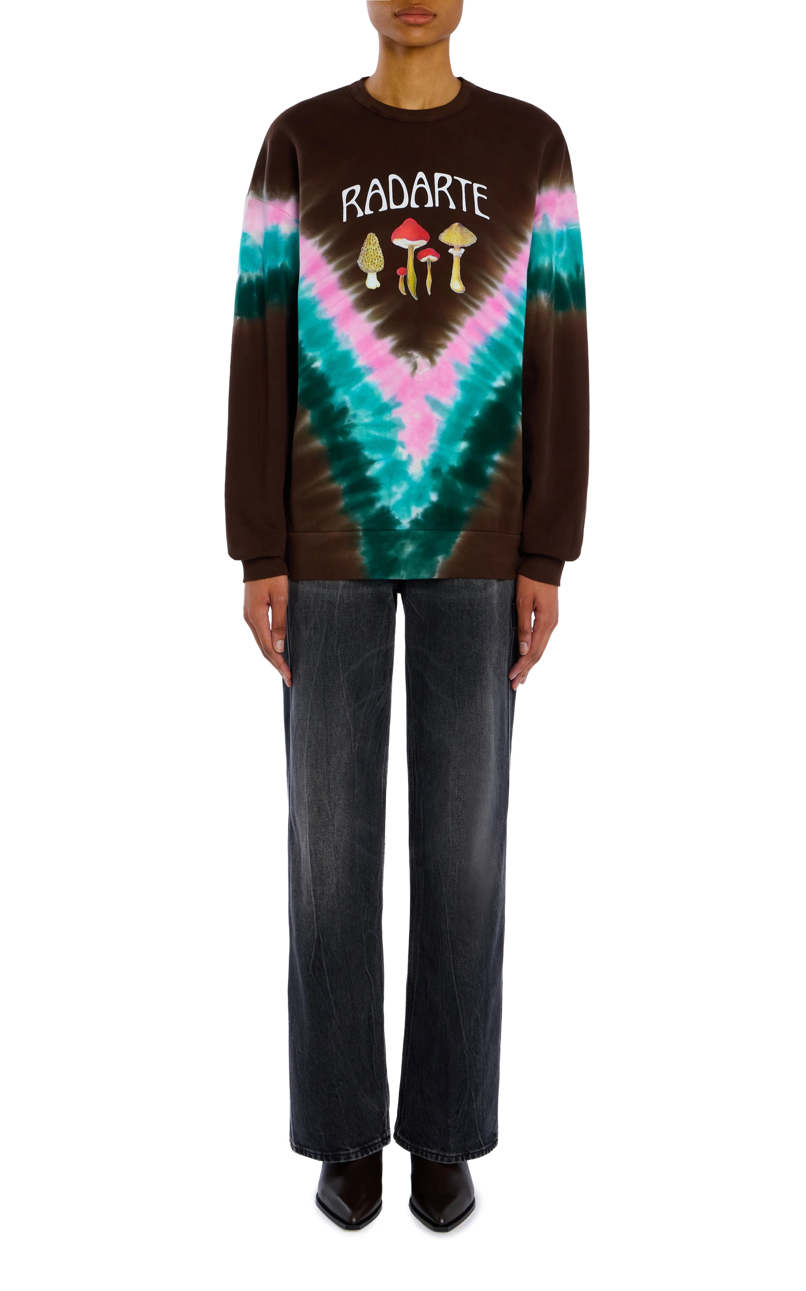 Our ultra soft, 100% cotton Tie Dye Radarte Logo Sweatshirt features ribbing details at the sleeves and waist, mushroom artwork, script font logo, and a classic silhouette. Color is faded black with green, aqua, violet pink and white.Â